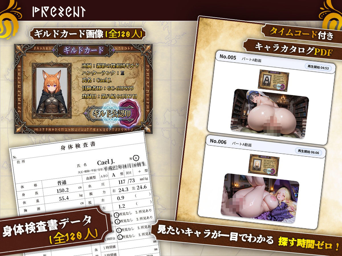 ■超豪華!同梱特典(全120人) 1ギルドカードデータ(身分証フェチ向け特典) 2身体調査書(身長・体重・握力など) 3タイムコード付きカタログPDF 各動画の内容を画像+再生開始時間で一覧化したカタログPDFを同梱。 見たいキャラ・シーンを一目で探せて、すぐに再生できます。 ■パワーアップした、どすけべモーション! 今作ではセックスの肉感的な動きがさらにパワーアップしました。 異世界人たちの弾力のある巨乳と美尻が、ぶるんぶるん、ばいんばいんと揺れまくります。 ■全員フィニッシュ仕様!120人全員に、絶頂シーンを用意しました! 異世界人たちのクライマックスの瞬間を、余すところなく収録しています。 映像だけでなく音声付きだからこそ伝わる、息遣いや声の揺らぎが臨場感を高めます 視覚と聴覚の両方から、没入感のあるひとときをお楽しみください。 ■総勢120人、総尺2時間越えの抜き放題ボリューム 【解像度】 3840×2160px(4K動画/mp4/60fps) 【収録内容】 ・異世界人と中出しセックス(1人につき約1分15秒、正常位、騎乗位、バック、即位など多彩な体位!) パートA 30人(収録時間:36分38秒) パートB 30人(収録時間:36分38秒) パートC 30人(収録時間:36分38秒) パートD 30人(収録時間:36分38秒) ■設定 王国最強と謳われた勇者パーティは、一夜にして壊滅した。 だが全員が命を落としたわけではない。 敗北後、戦場から‘選ばれた’女たちがいた。 理由も基準も知らされないまま、 名を奪われ、番号を与えられる。 告げられた新たな役割は――慰労担当。 剣も誇りも失った彼女たちが、 敗北のその先で与えられた運命に向き合う物語。 ■最先端AIが到達した異世界人が乱れる ド迫力4Kエロアニメ! 本作は最新AI動画技術を駆使し、 ダイナミックで濃密なシーン表現を追求。 思わず目を奪われる、生々しいエロスを体感してください。 AI使用箇所について 画像生成AIのカスタムモデルでイラストを生成後、動画生成AIでアニメーションさせています。 ※登場人物は全員18歳以上になるようにAI生成しております。 ※本作に登場する人物は全員成人済みです。 ※この作品は架空の物語でありフィクションです。実在の団体・人物とは一切関係ありません。 ※犯罪・違法行為を助長・美化する意図はありません。 ※本作品の複製、インターネットへの無断アップロード、無断販売・レンタルすることを固く禁じます。